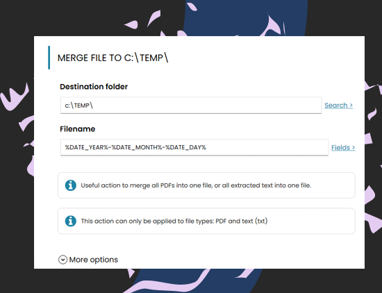 • Merge multiple files into a single consolidated PDF or text file, perfect for future integration into your ERP, CRM, or document archive systems